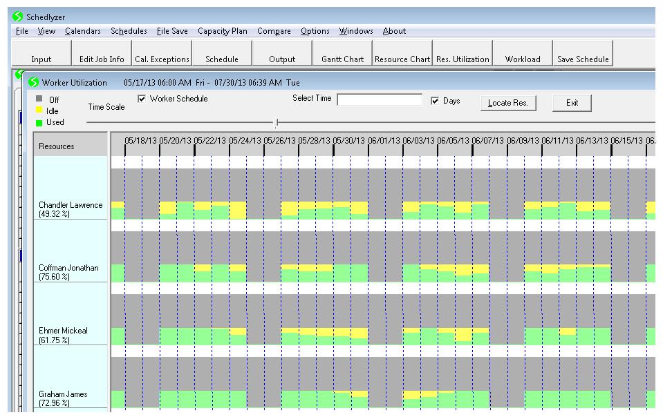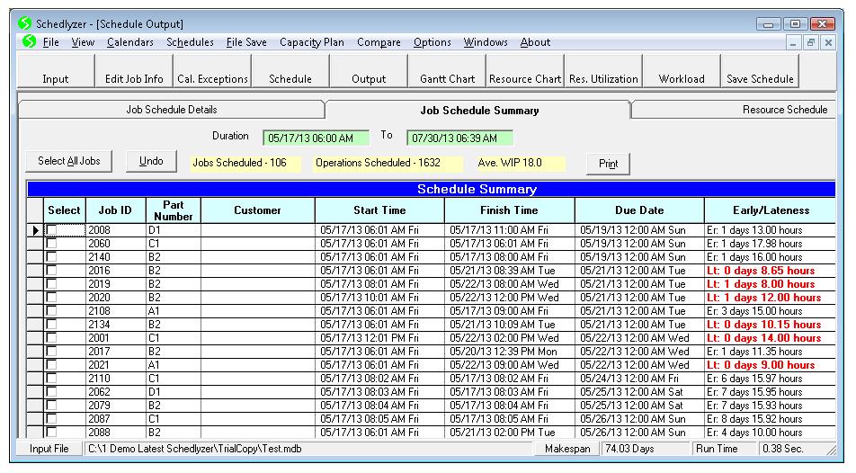 Schedule output consists of job schedule summary, resource utilization percentages (for any selected time